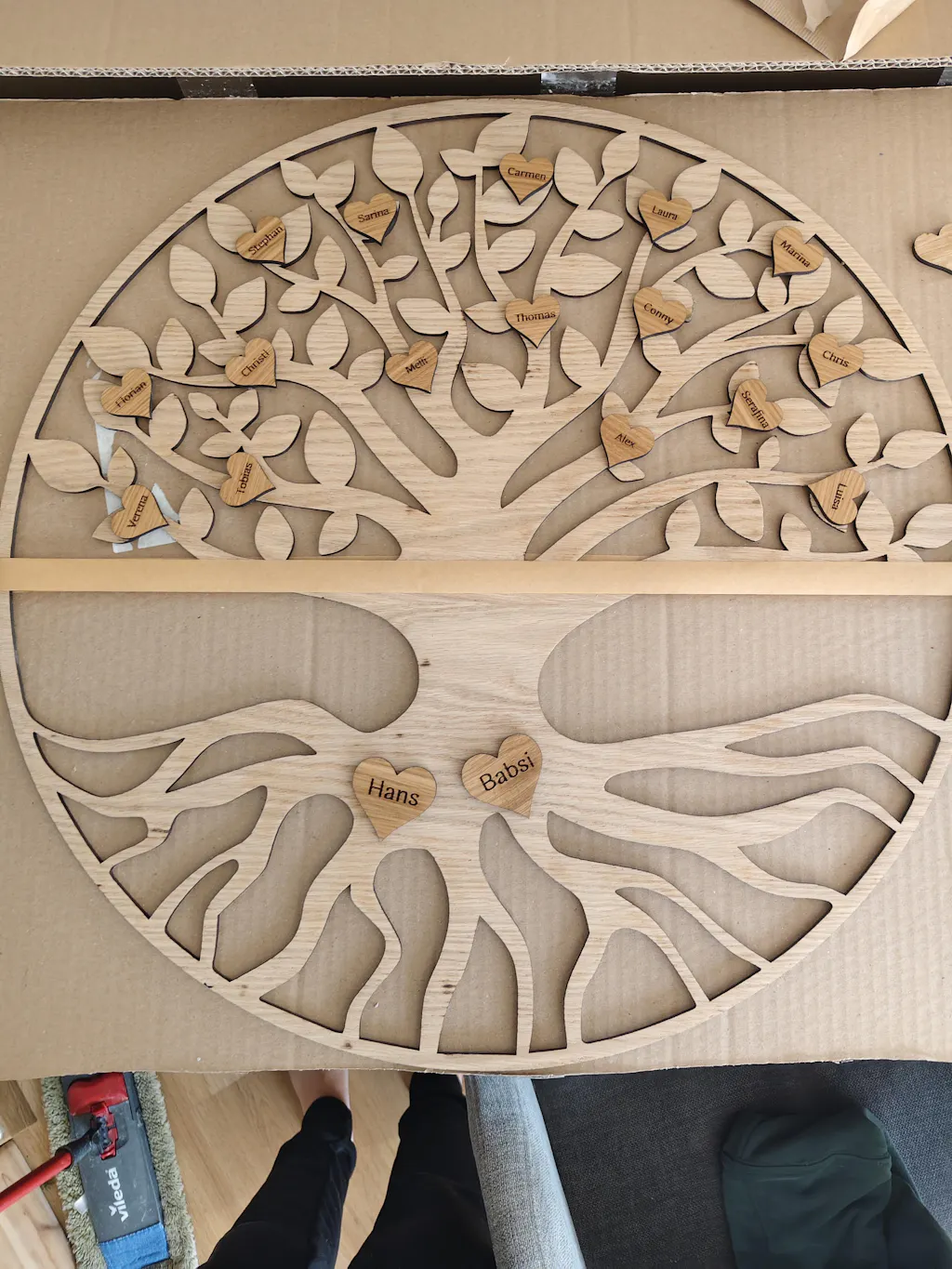 Ein einzigartiges Erinnerungsstück für deine Familie – mit gravierten Namen, gefertigt aus hochwertiger Eiche. Als Stammbaum, Geschenk oder Deko – zeitlos und emotional.
